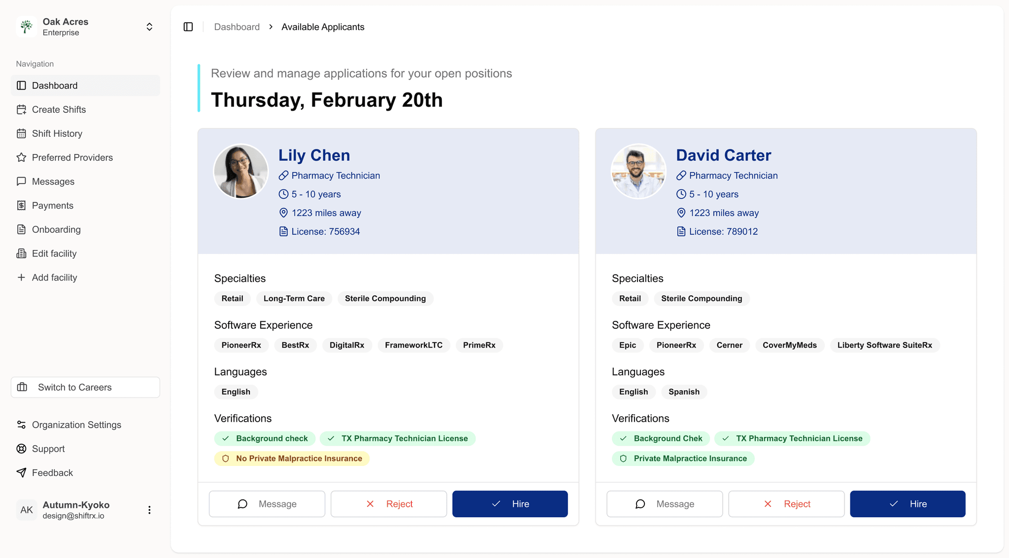 ShiftRx is a staffing platform designed for the pharmacy industry. It helps pharmacies quickly find and hire qualified professionals—whether for full-time positions or on-demand shift work—by streamlining the matching and scheduling process through AI.